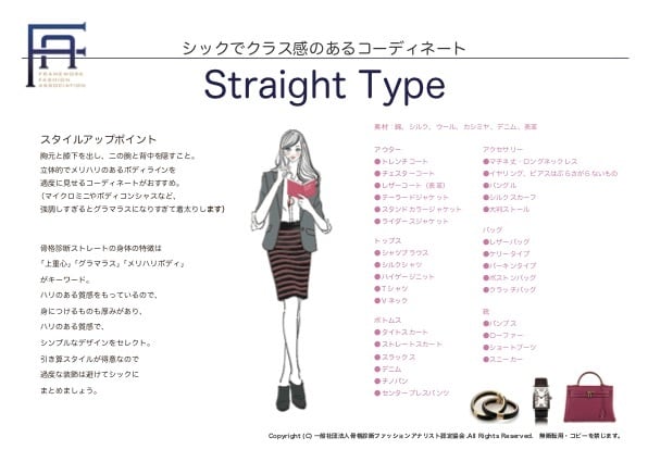 ストレートタイプの特徴やスタイルアップポイント、おすすめアイテムが1シート(A4サイズ)にまとまっています。